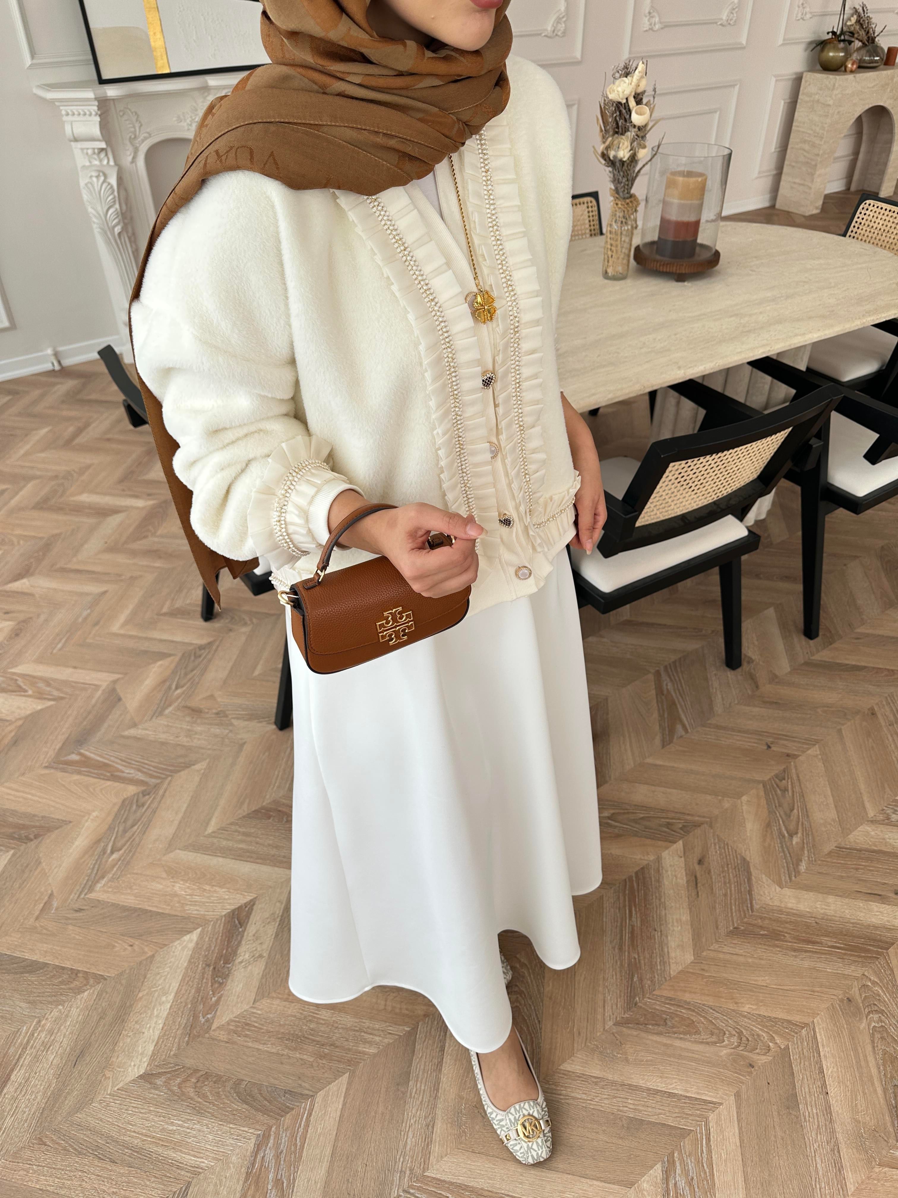 Fırfır Detaylı Peluş Hırka Ekru