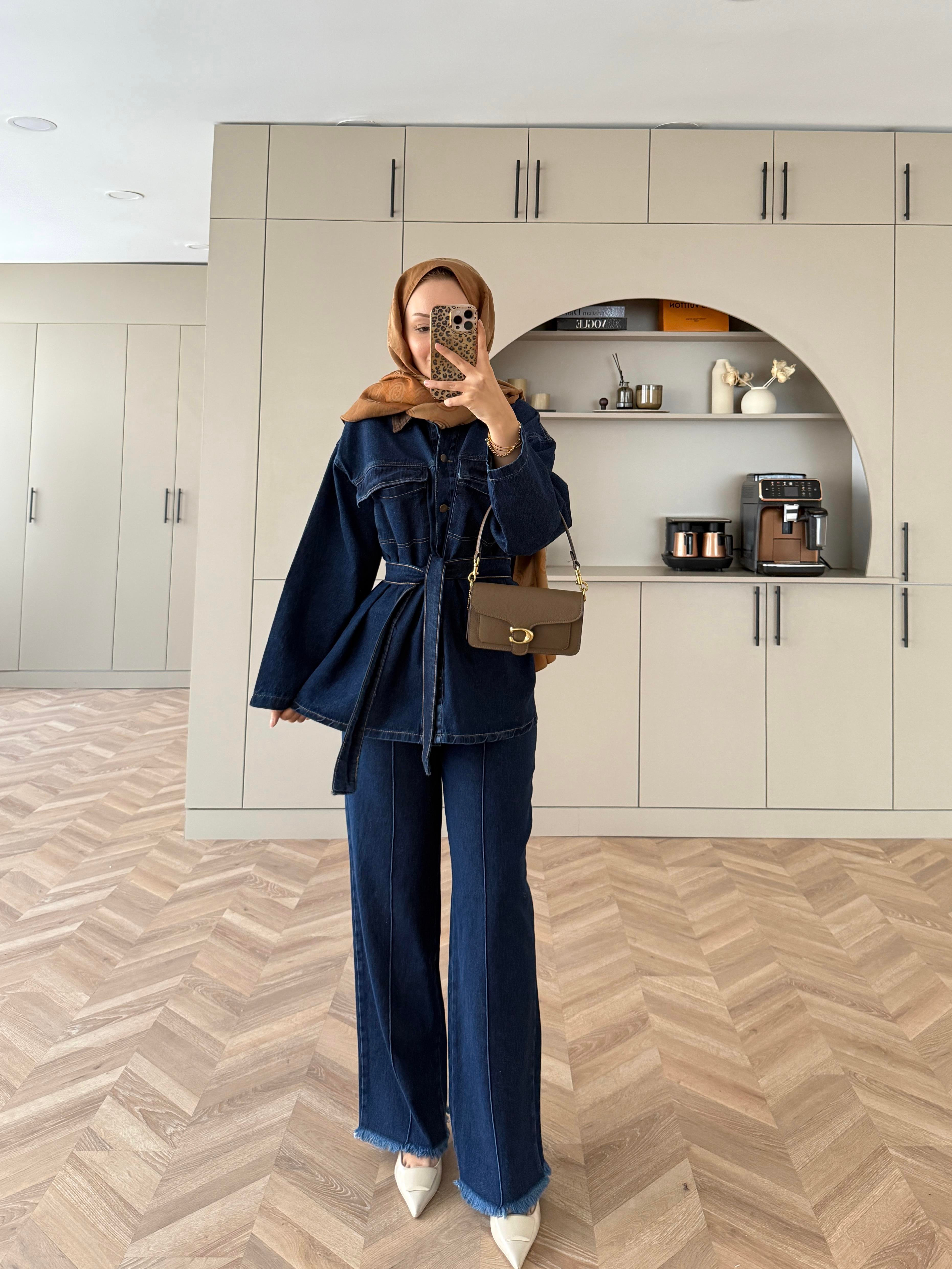 Kot kumaştır - Yakası kadife detaylıdır ceplidir- Seyyar kuşaklıdır - Pantolon beli arkadan lastiklidir önü düğmelidir -