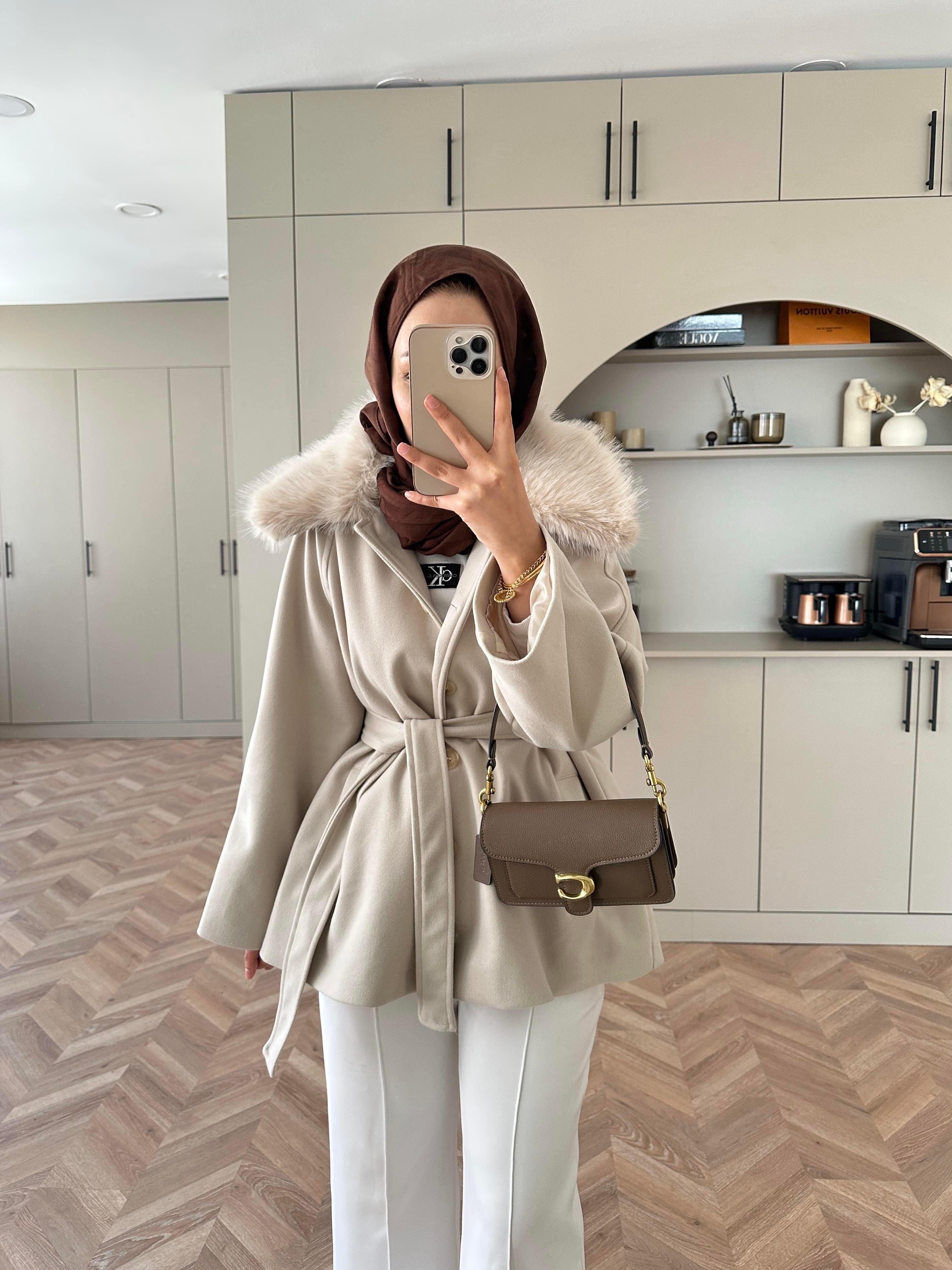 Kaşe kumaştır - Kürk detaylıdır - Düğmelidir - Seyyar kuşaklıdır - Astarlıdır - Kürk çıkabilir