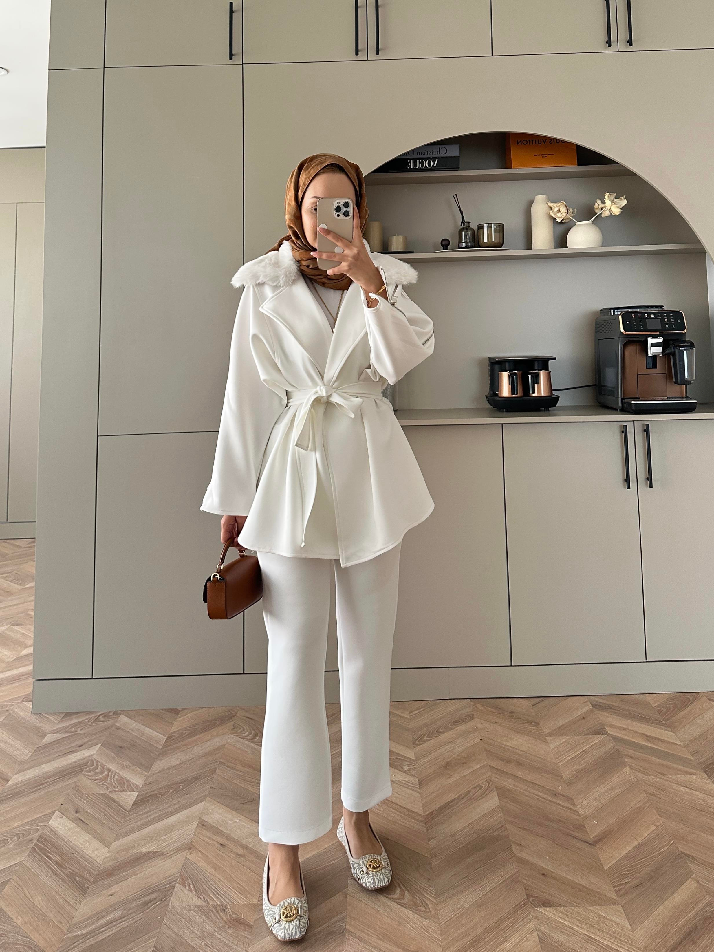 Scuba kumaştır - seyyar kuşaklıdır - çıkarılabilir kürklüdür - kolları omuza kadar fermuarlıdır - pantolon beli lastiklidir - ceplidir