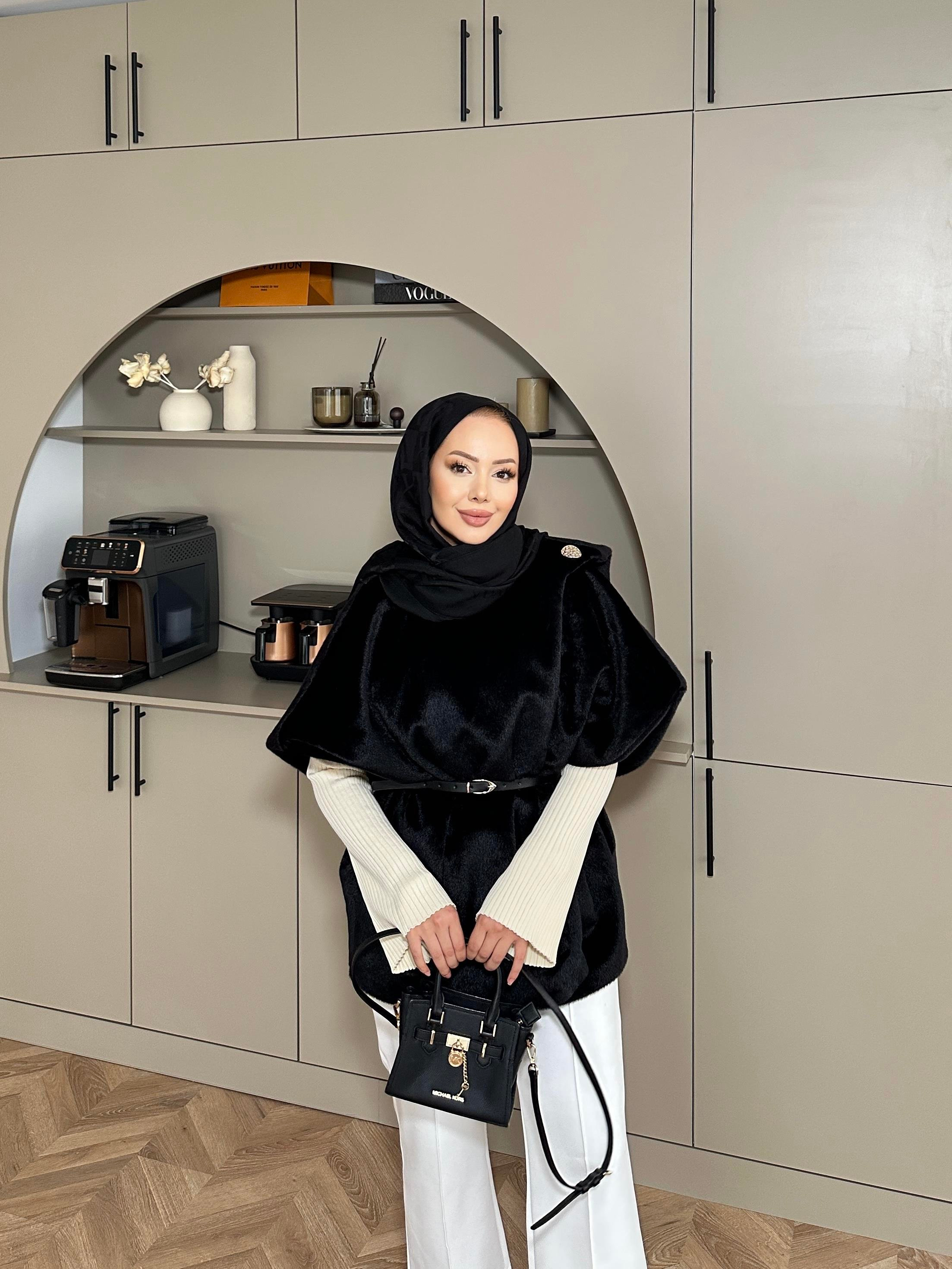 Kaşe kumaştır - Omzunda şal detayı mevcuttur - Deri ince kemer mevcuttur  - Astarlıdır